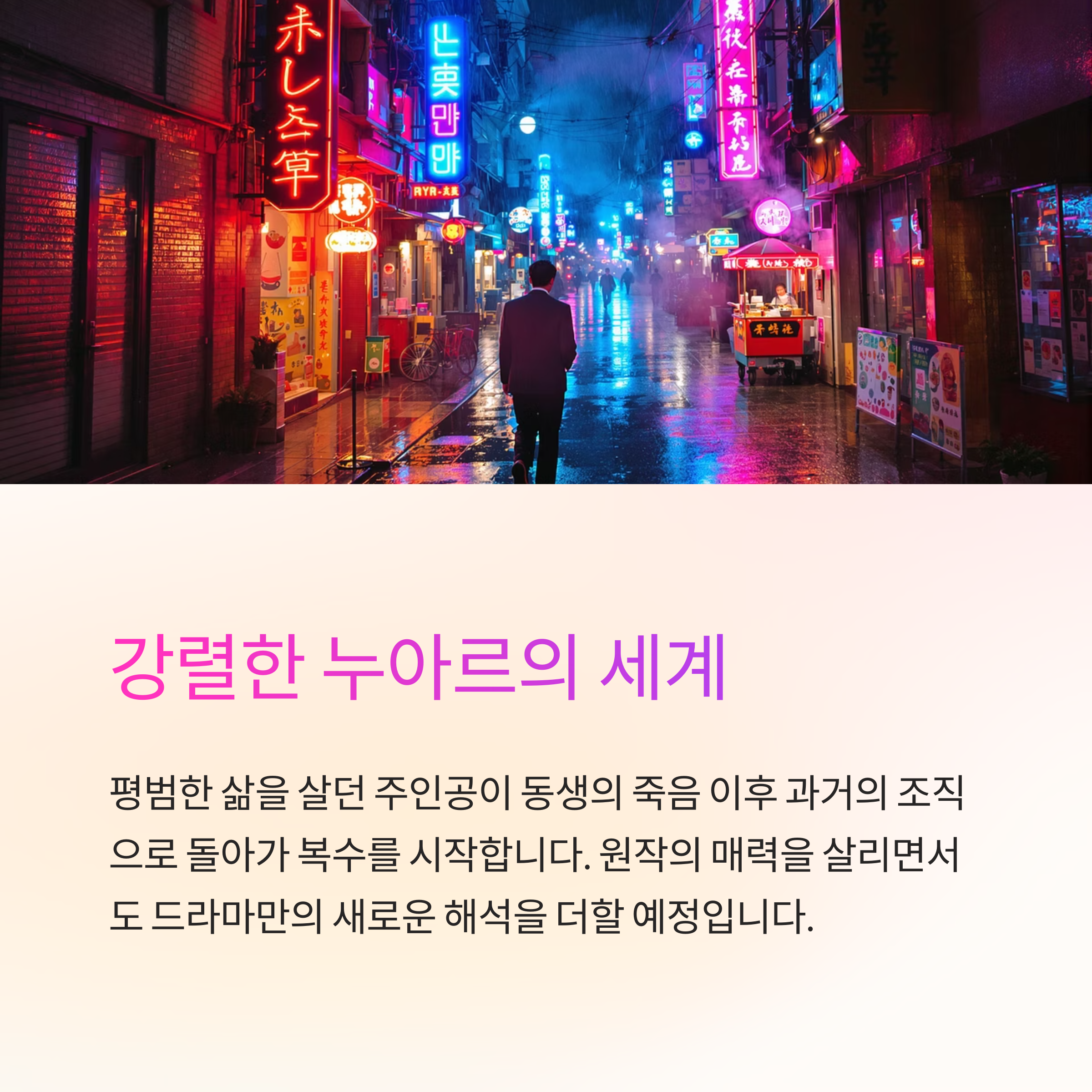 복수와 배신, 그리고 그 속에서 피어나는 인간적인 고뇌를 담아낼 이 작품은 누아르 장르를 좋아하는 시청자들에게 깊은 인상을 남길 것으로 예상됩니다.
