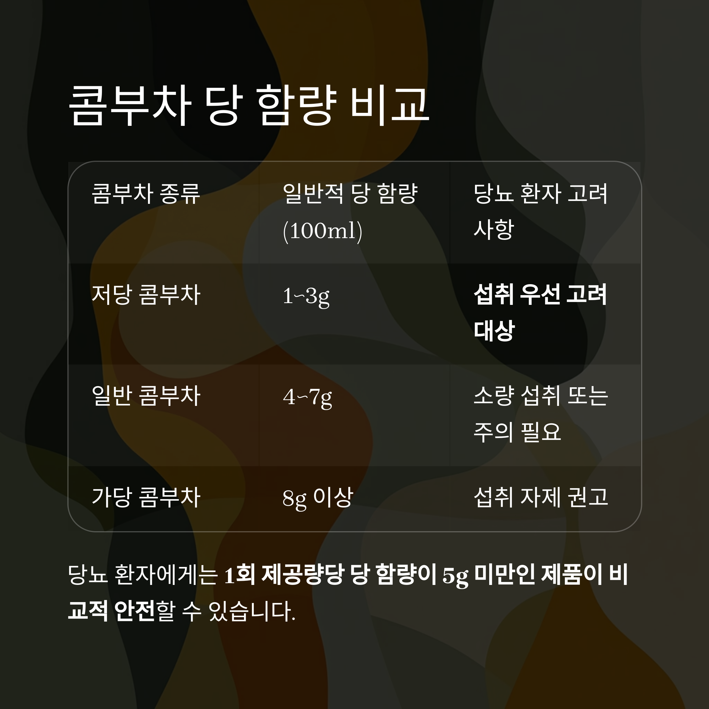 | 콤부차 종류 | 일반적 당 함량 (100ml 기준) | 당뇨 환자 고려사항 |