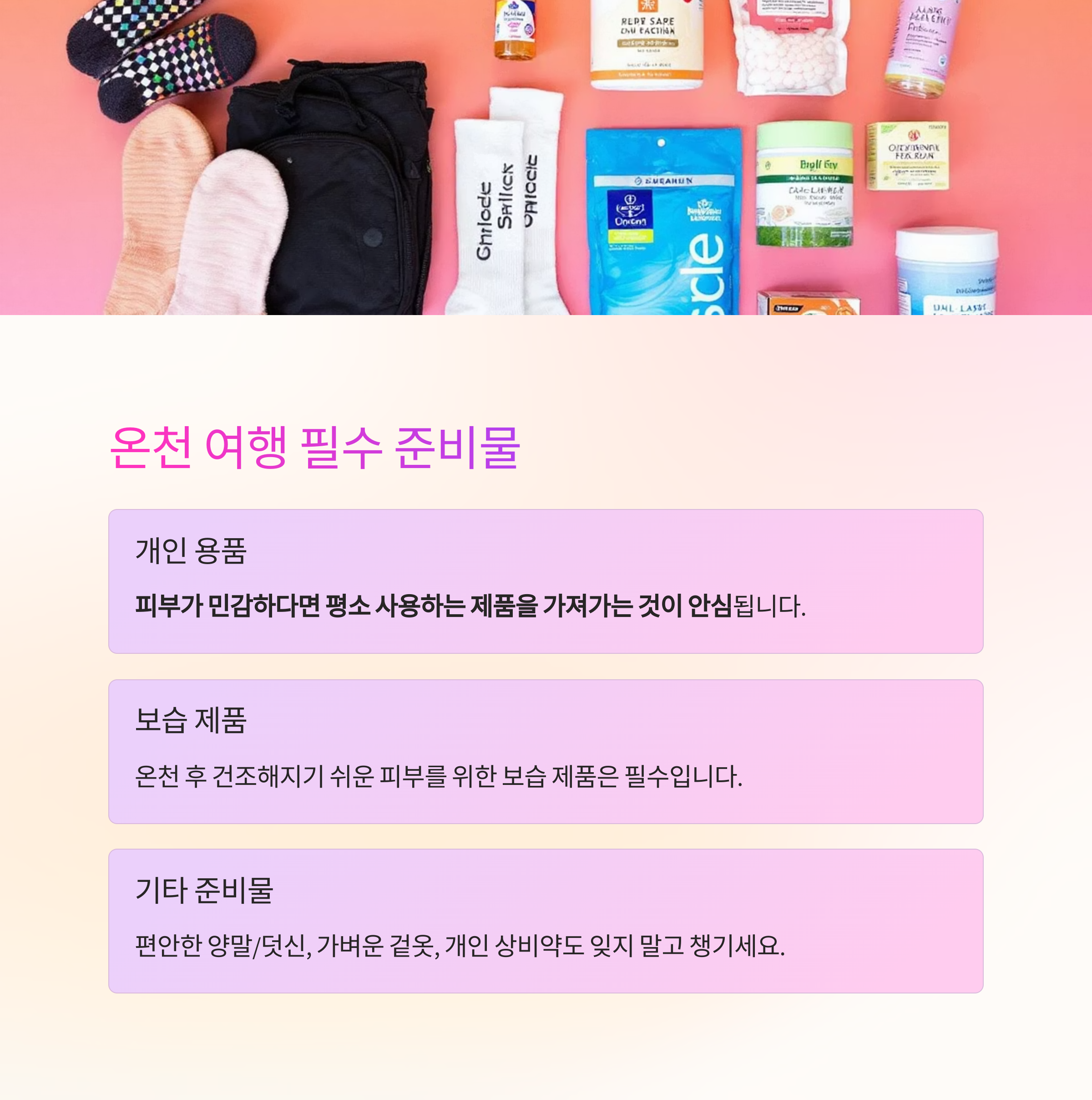 온천 후 건조해지기 쉬운 피부를 위해 보습 제품도 필수입니다.