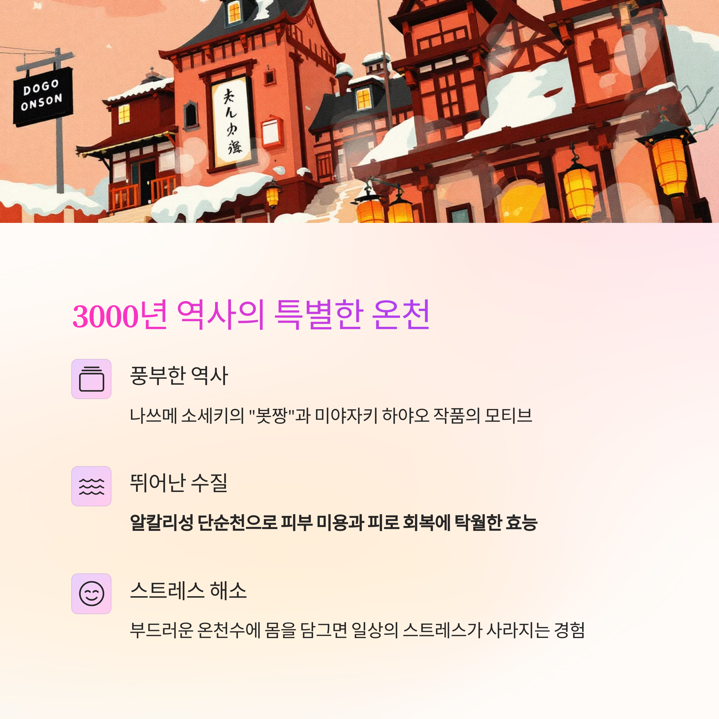 약 3000년의 역사를 자랑하는 이 온천은 나쓰메 소세키의 소설 "봇짱"의 배경이 되기도 했으며,