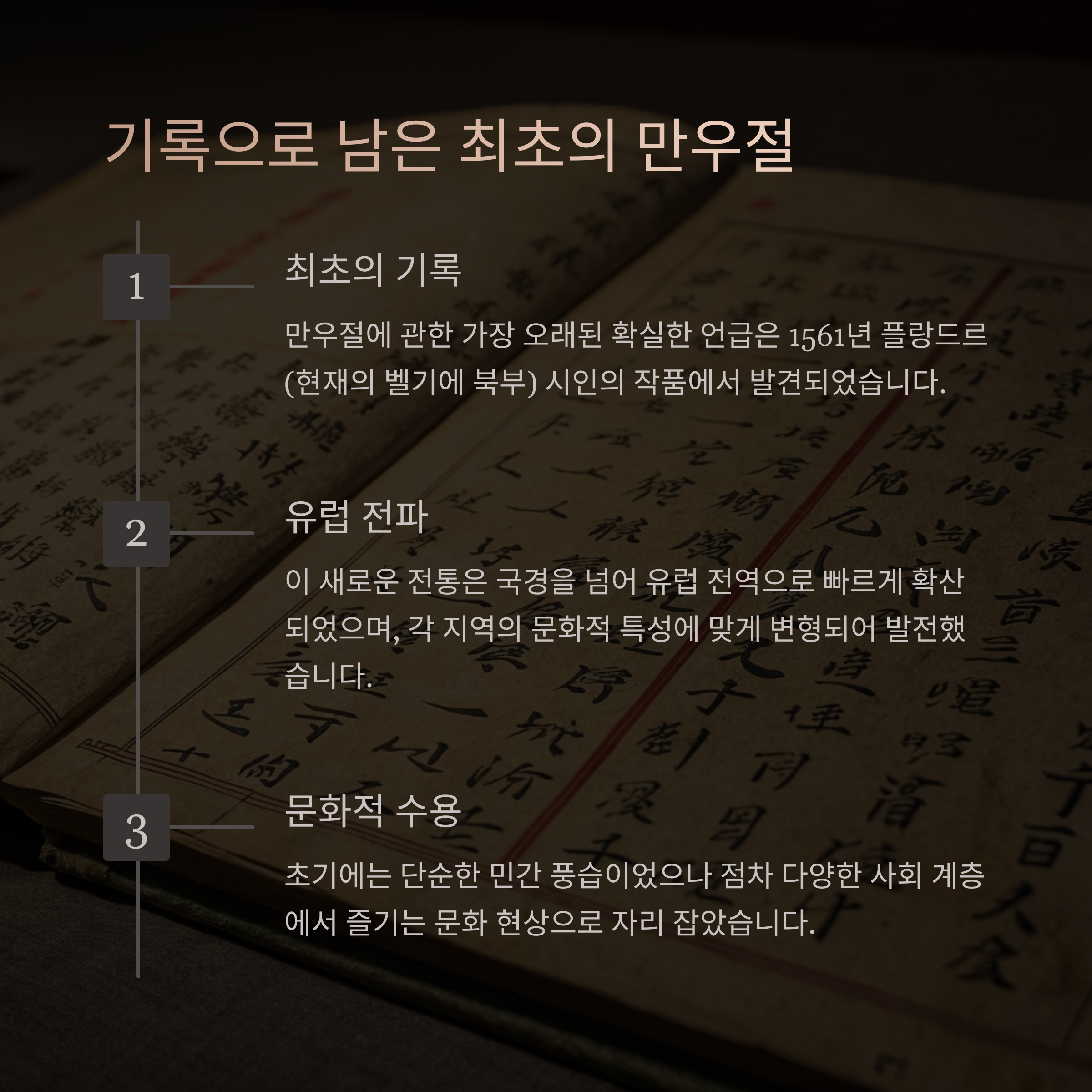 만우절과 관련된 가장 오래된 기록으로는 1508년 프랑스 시인 엘로이 다메르발(Eloy d'Amerval)이 언급한 "poisson d'avril(4월 물고기)"이 있습니다. 그러나 이것이 정확히 만우절을 가리키는지는 명확하지 않습니다.