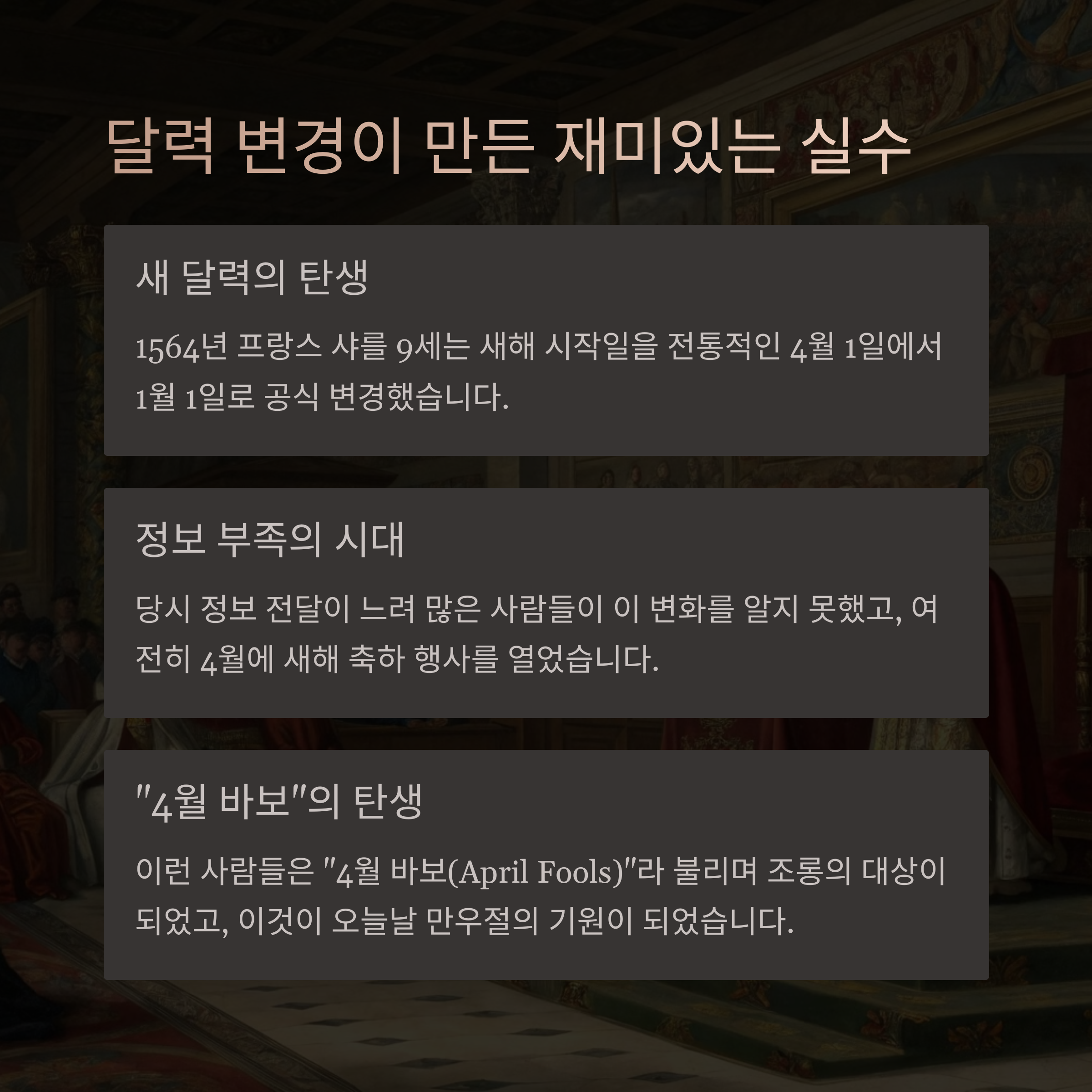 만우절(April Fools' Day)의 정확한 기원은 여전히 미스터리로 남아있지만, 역사학자들은 몇 가지 유력한 이론을 제시하고 있습니다. 가장 널리 알려진 이론은 16세기 프랑스에서 율리우스력(Julian calendar)에서 그레고리력(Gregorian calendar)으로의 전환과 관련이 있습니다.