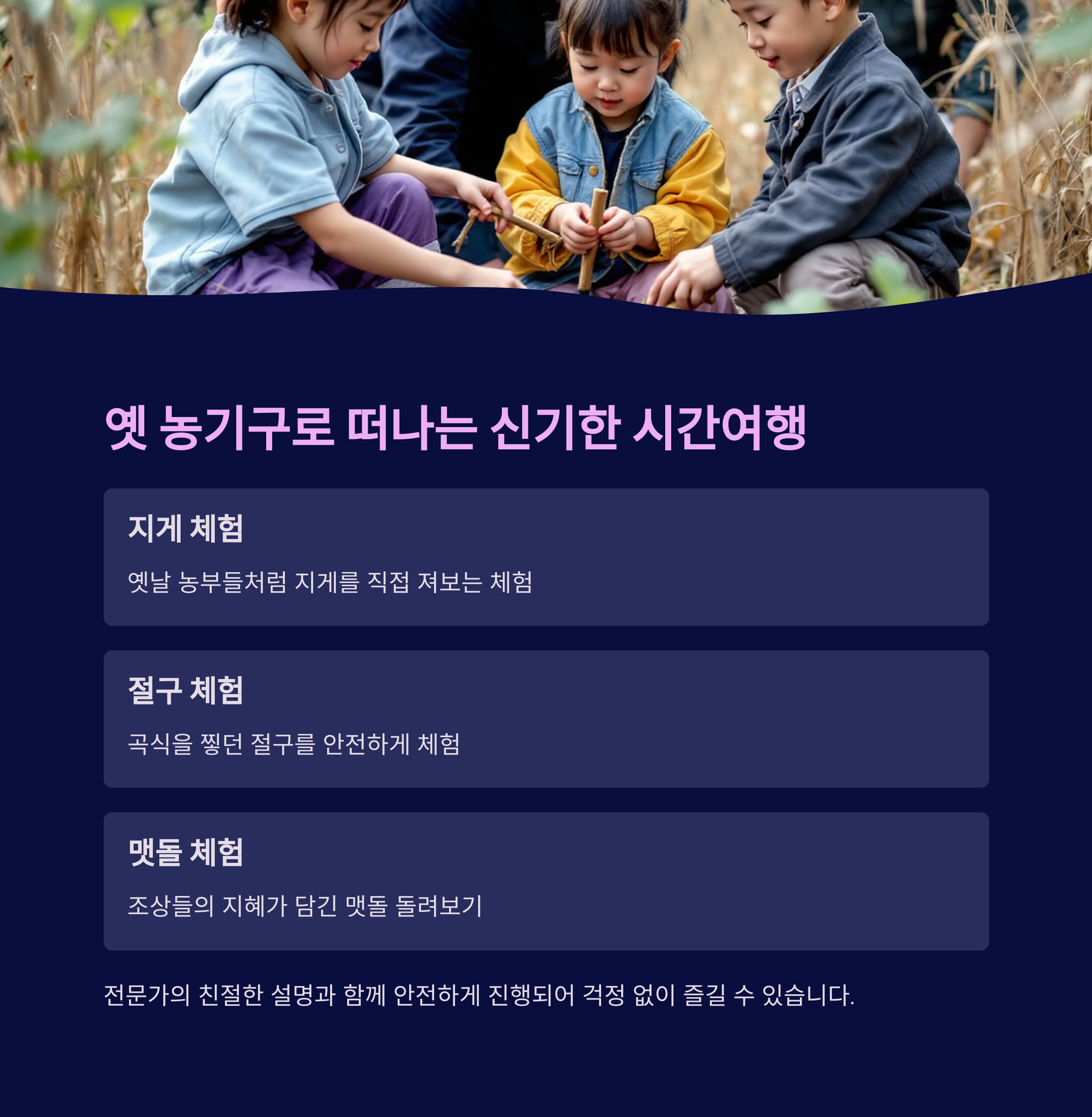 - 오후 (13:00 ~ 16:00): 전통 농기구 체험장에서 신나는 시간을 보내고,
