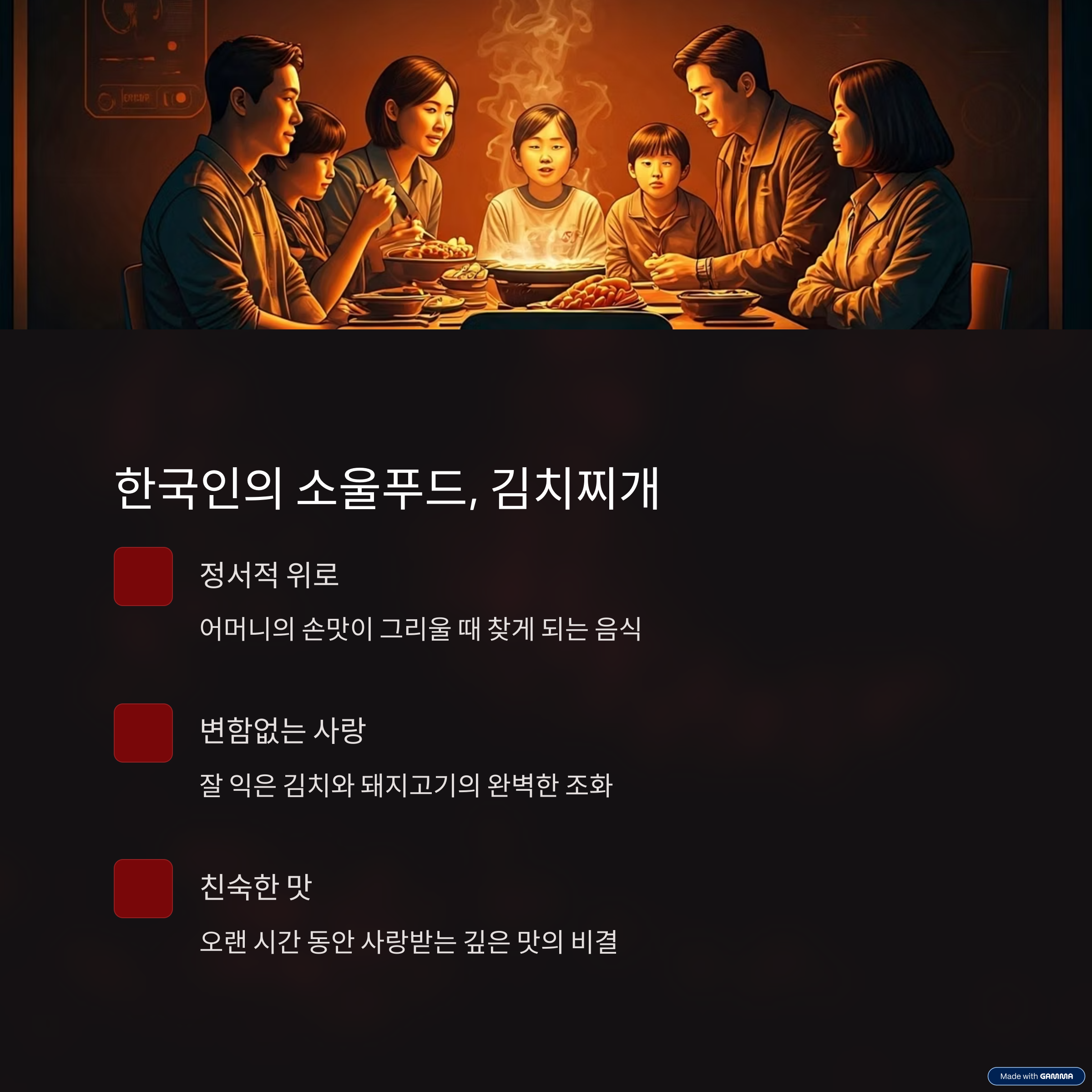 김치찌개는 단순한 음식을 넘어 한국인의 정서와 문화를 담고 있는 특별한 존재입니다. 어머니의 손맛이 그리울 때, 얼큰한 국물로 스트레스를 풀고 싶을 때, 우리는 자연스럽게 김치찌개를 찾곤 합니다. 잘 익은 김치와 돼지고기의 조화는 언제나 최고의 만족감을 선사합니다. 오랜 시간 동안 변함없이 사랑받는 이유는 바로 그 친숙함과 깊은 맛 때문일 것입니다. 이처럼 김치찌개는 우리 밥상에서 빼놓을 수 없는, 소중한 음식입니다.