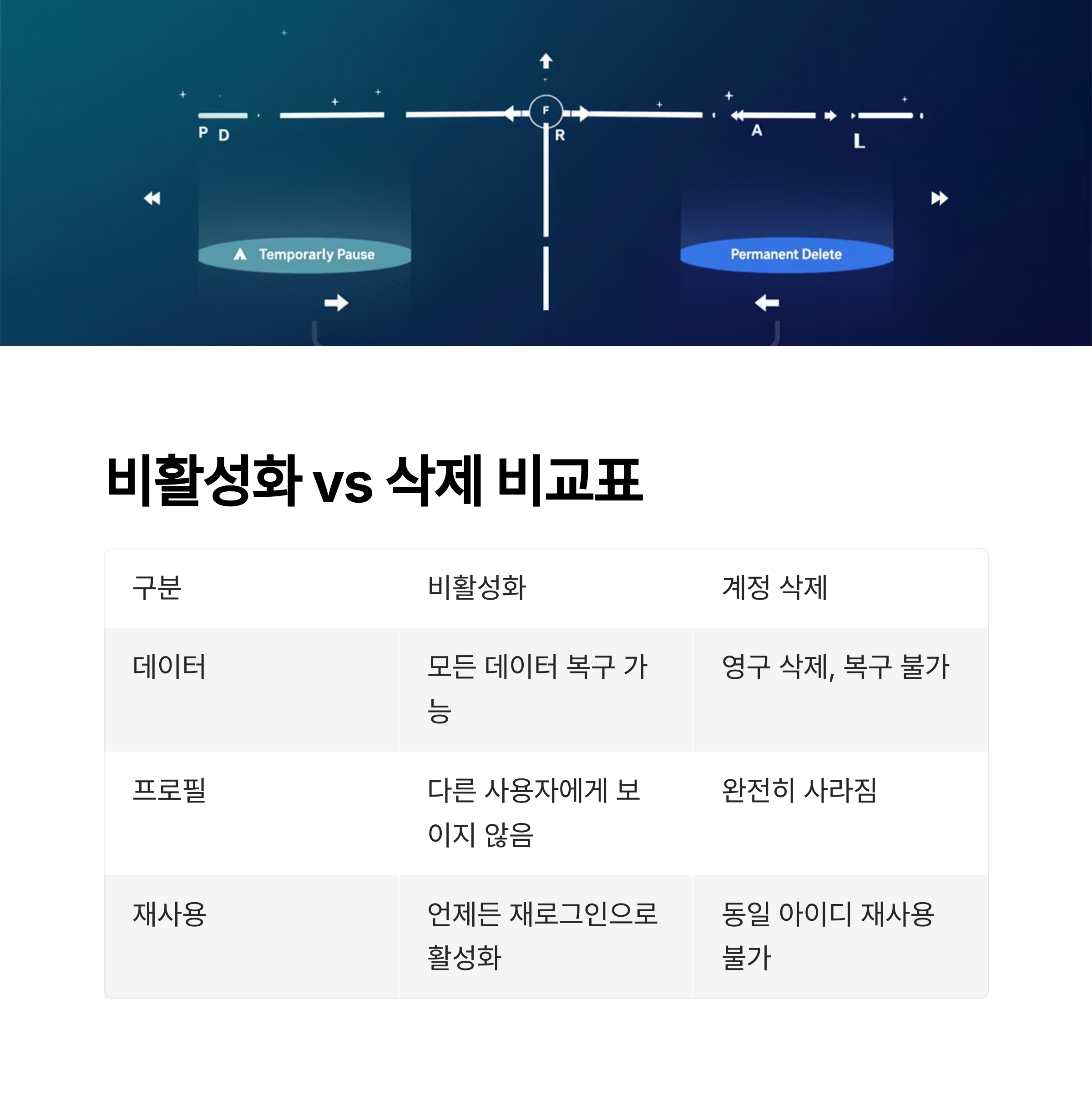 | 데이터 보존 | 일시적 숨김, 재활성화 시 모든 데이터 복구 가능 | 영구 삭제, 데이터 복구 절대 불가능 |