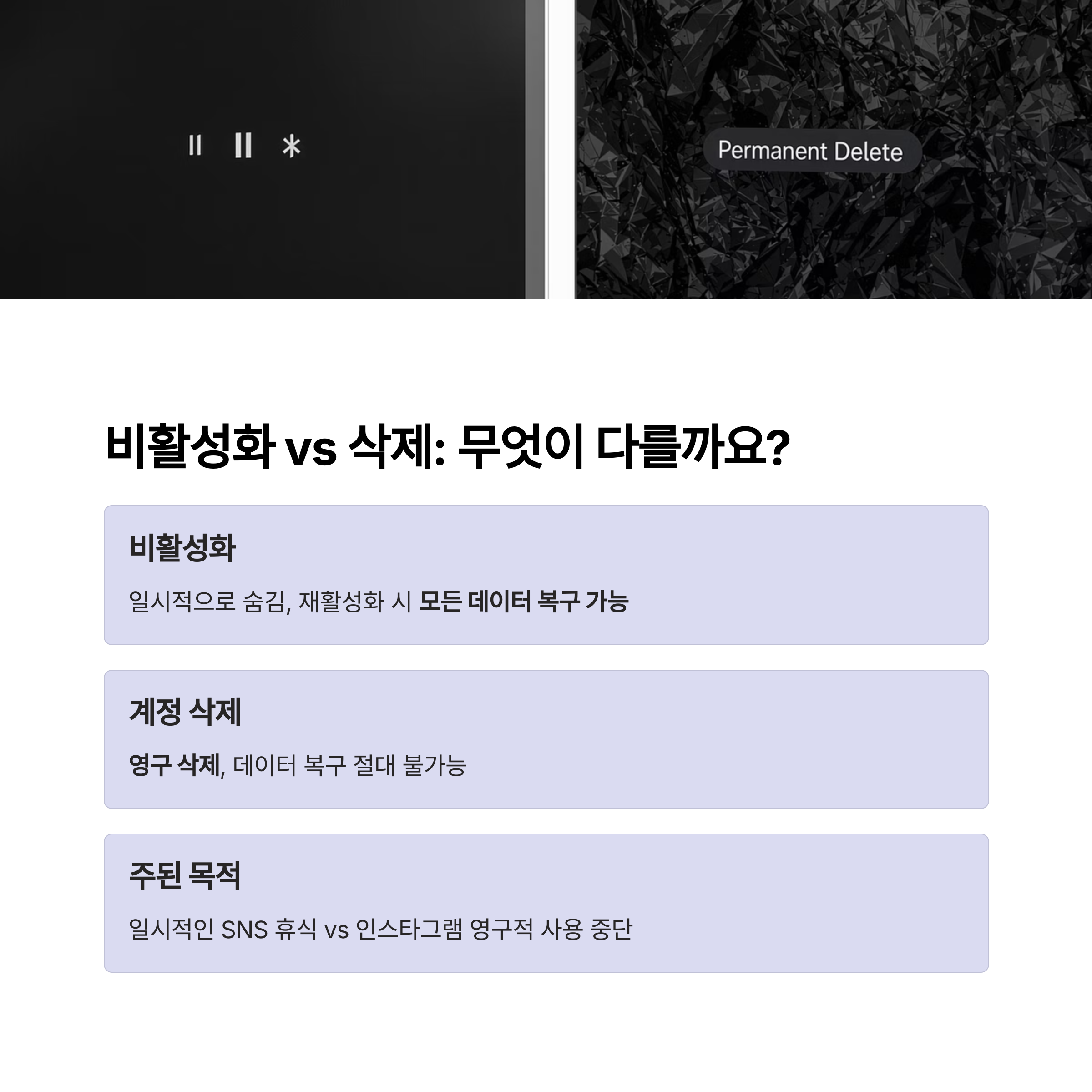 | 주된 목적 | 일시적인 SNS 휴식, 프라이버시 강화 | 인스타그램 영구적 사용 중단 및 데이터 삭제 |