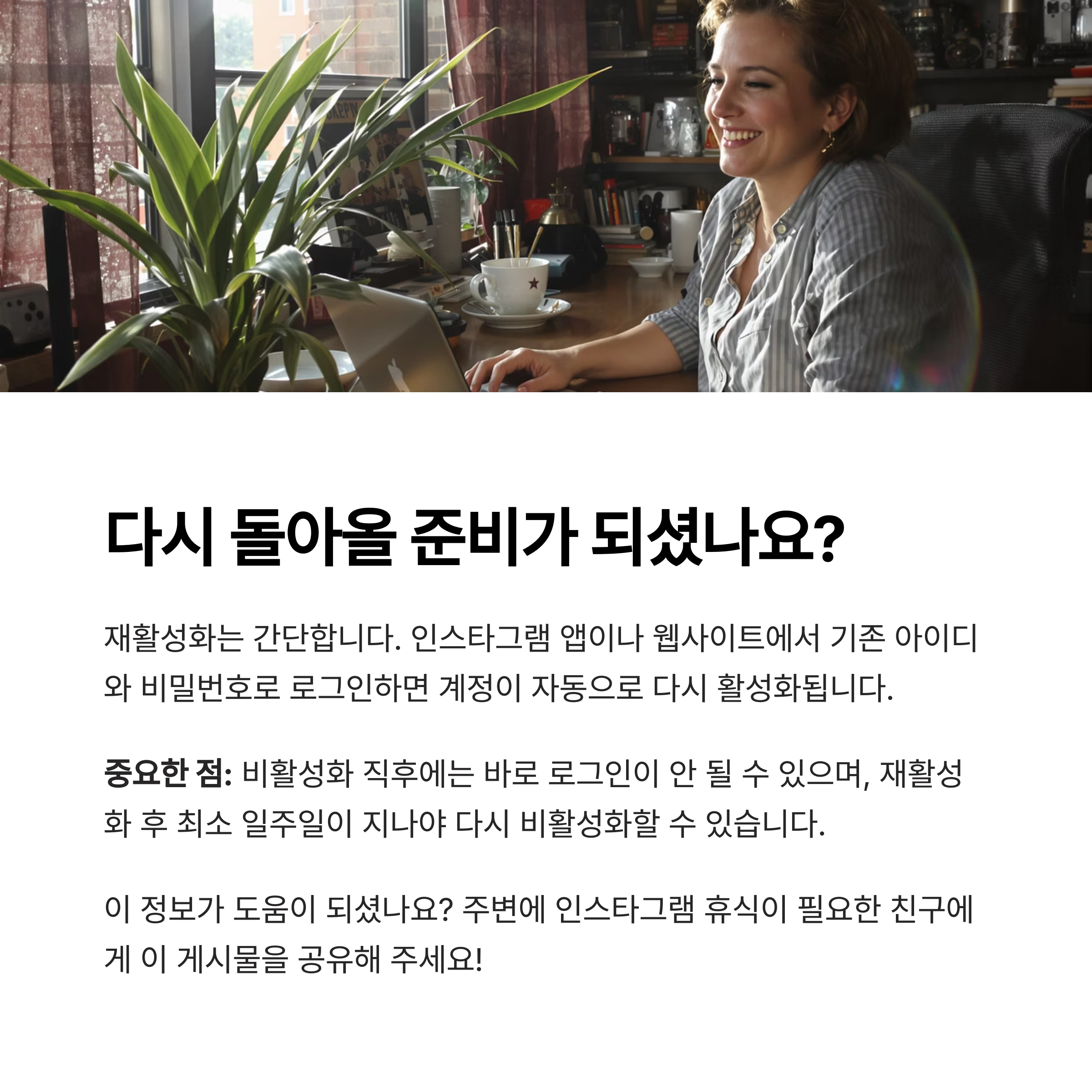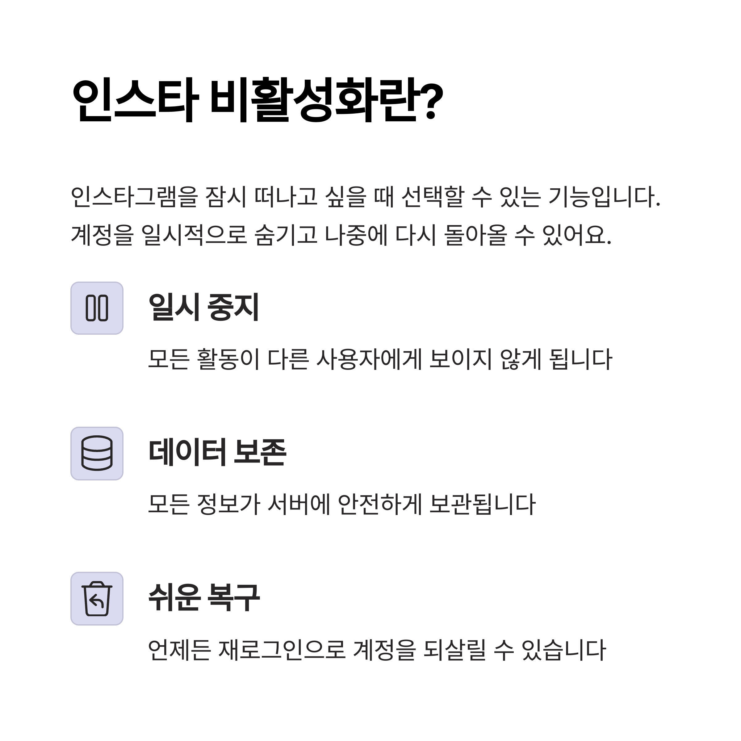 하지만 데이터는 인스타그램 서버에 그대로 보관되어, 언제든 재로그인하면 이전 상태 그대로 계정을 다시 사용할 수 있습니다.
