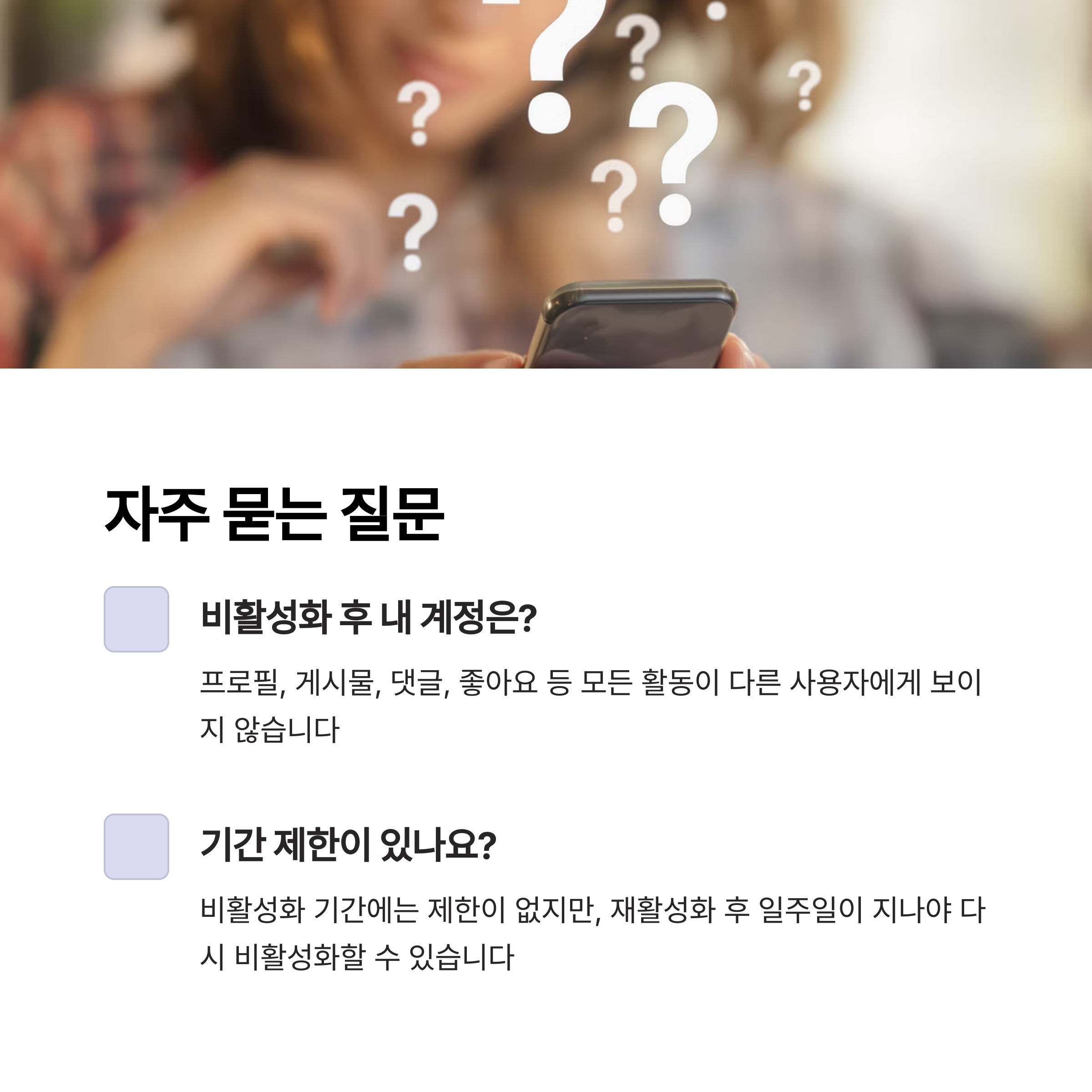 따라서 잠시 휴식이 필요하다면 비활성화를, 완전히 떠나고 싶다면 삭제를 고려해야 합니다.