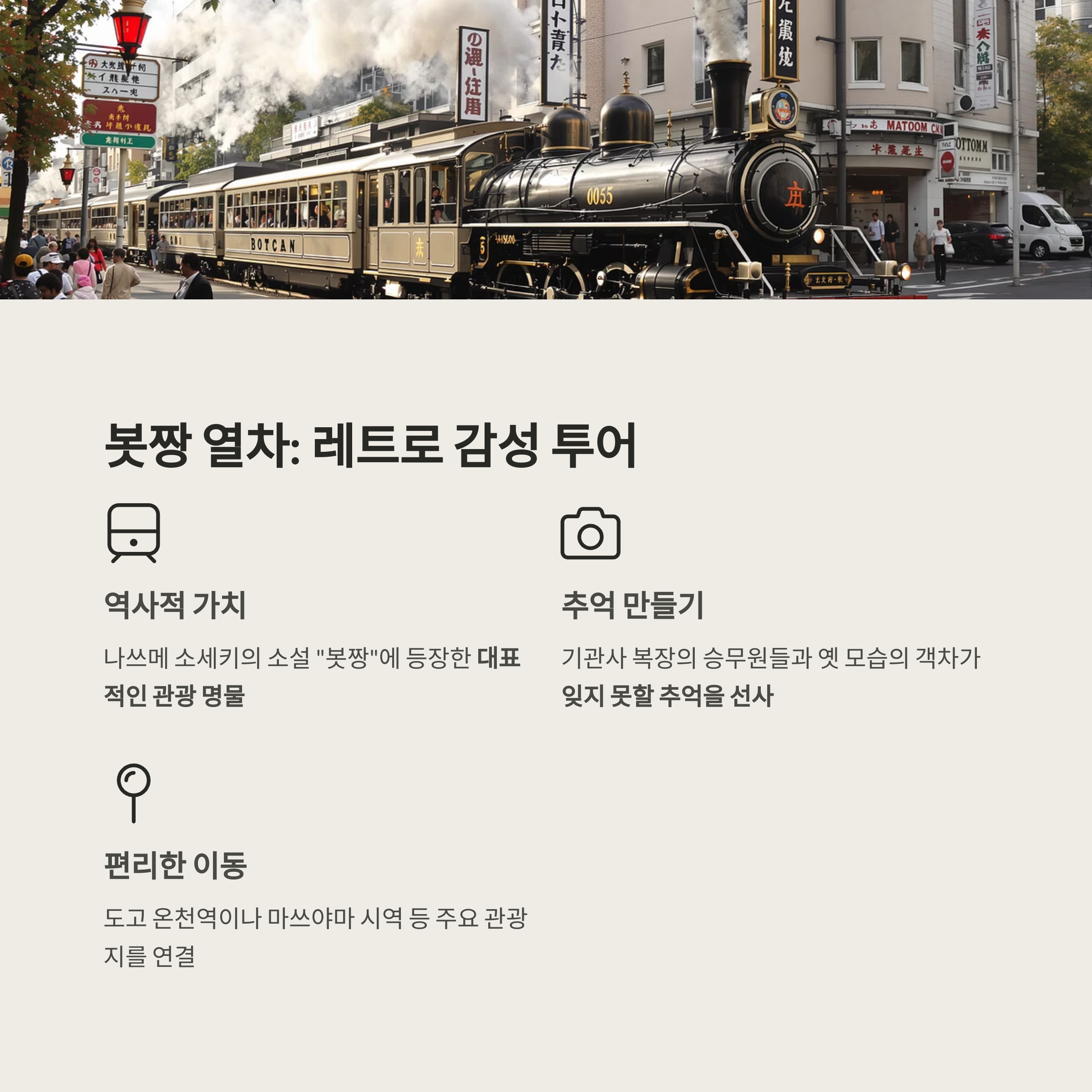 | 마쓰야마 성 → JR 마쓰야마 역 주변 | 시내 전차 또는 도보 | 약 15~20분 | 봇짱 열차 탑승 체험 (시간표 확인 필수) |