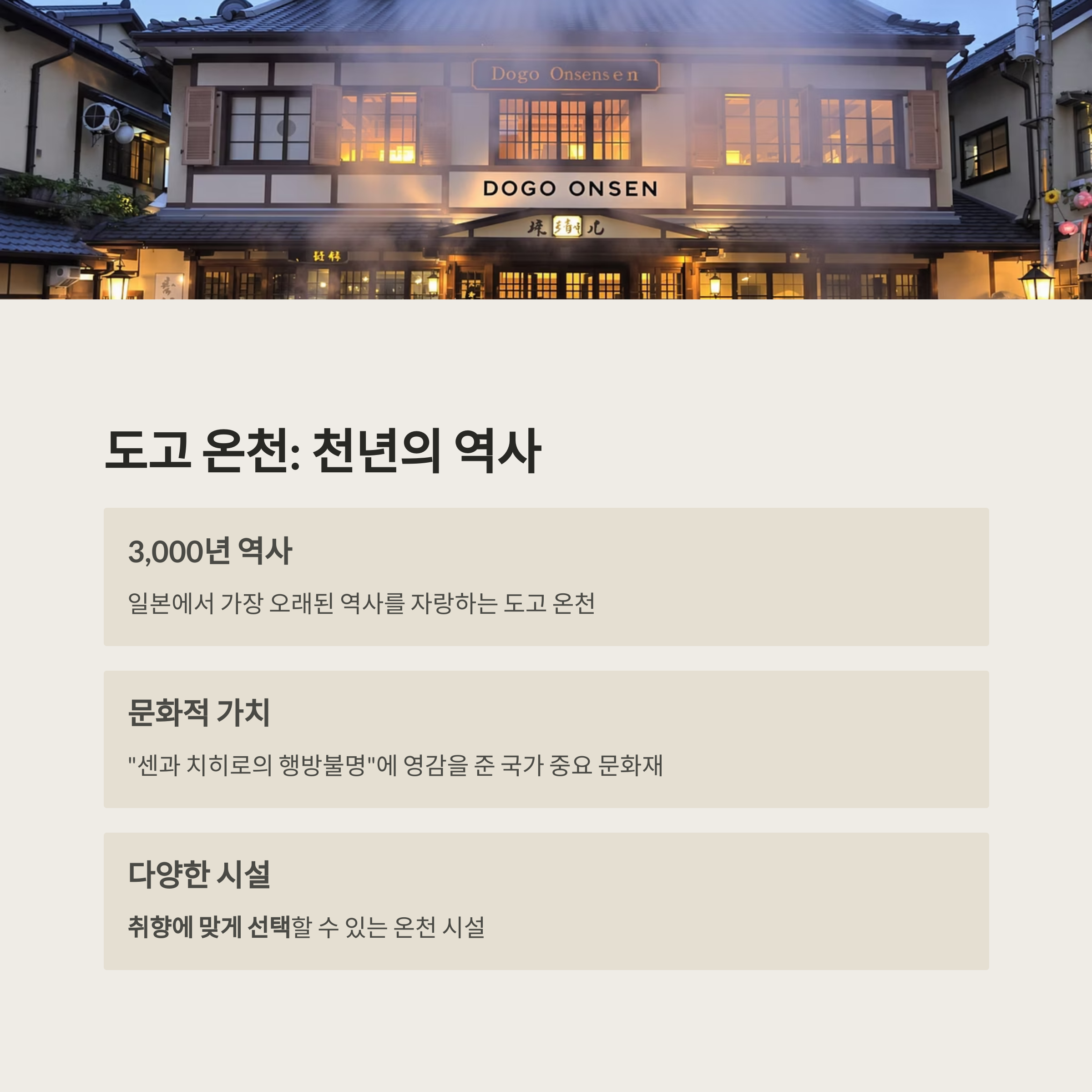 여행의 피로를 풀고 싶다면 도고 온천 방문은 필수입니다.