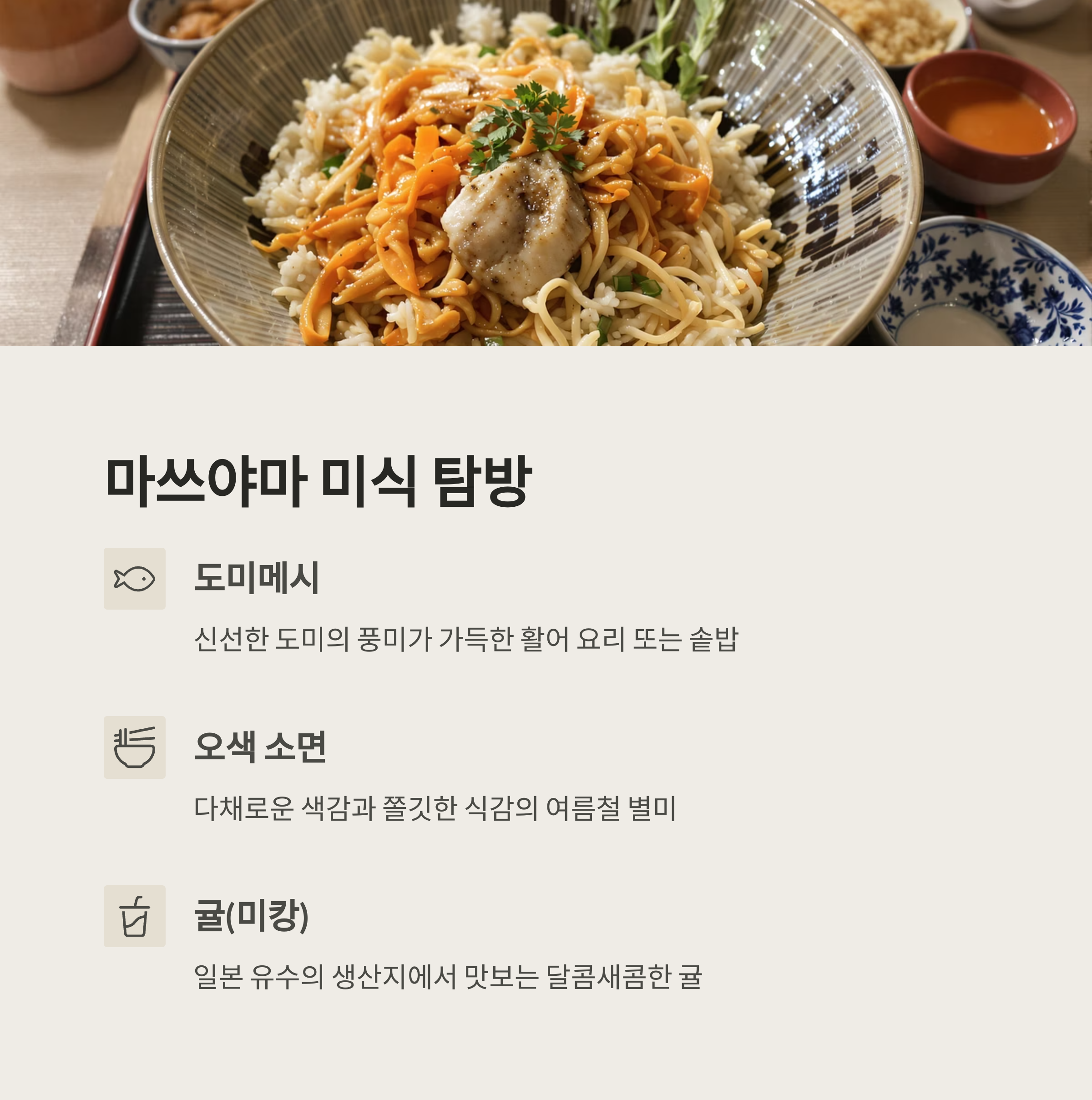 마쓰야마에서 꼭 맛봐야 할 대표 음식들은 여행의 즐거움을 한층 더해줄 것입니다.