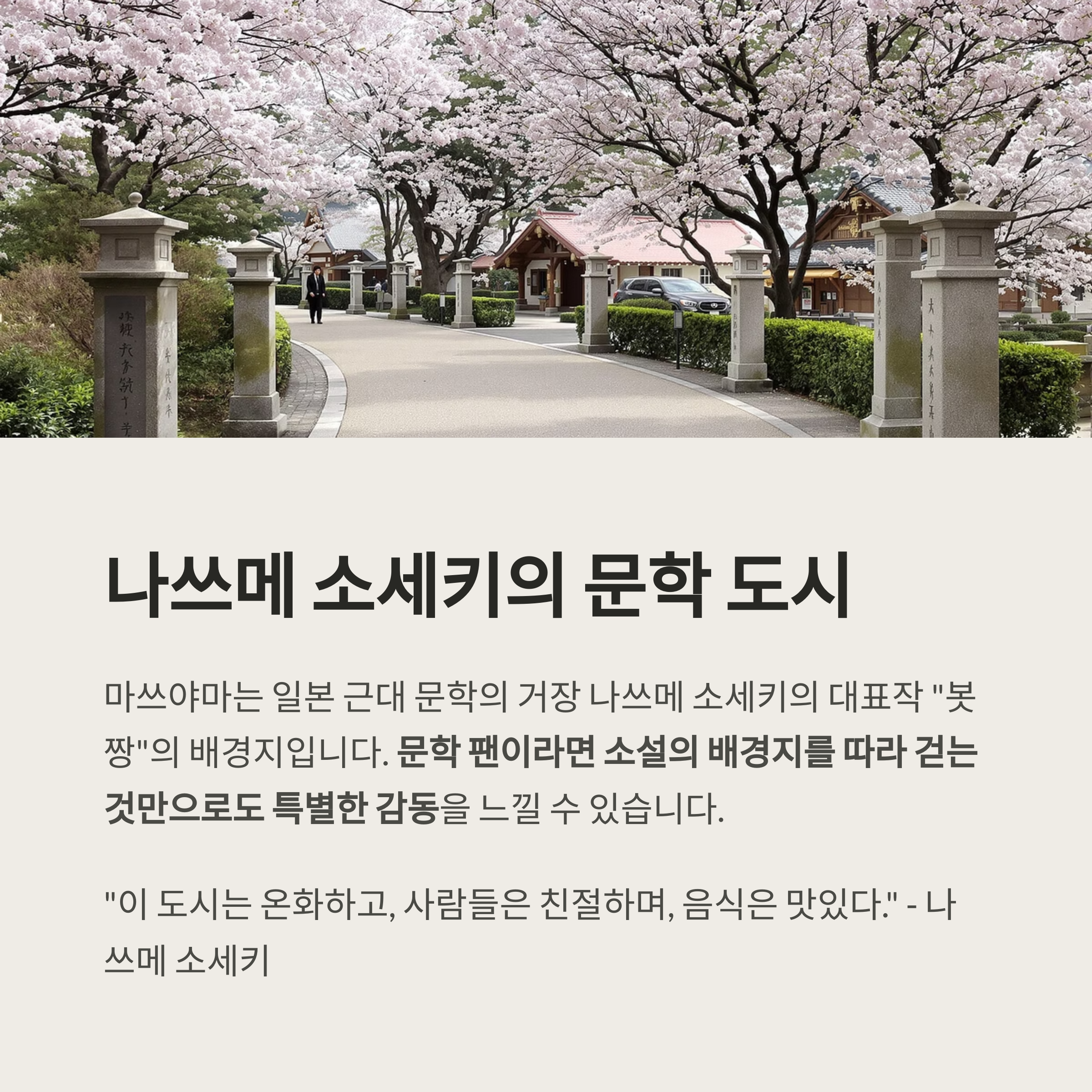 ""이 도시는 온화하고, 사람들은 친절하며, 음식은 맛있다."" 소세키가 마쓰야마에 대해 남긴 말처럼, 문학의 향기를 따라 걷는 마쓰야마 산책은 분명 평화롭고 즐거운 경험이 될 것입니다.