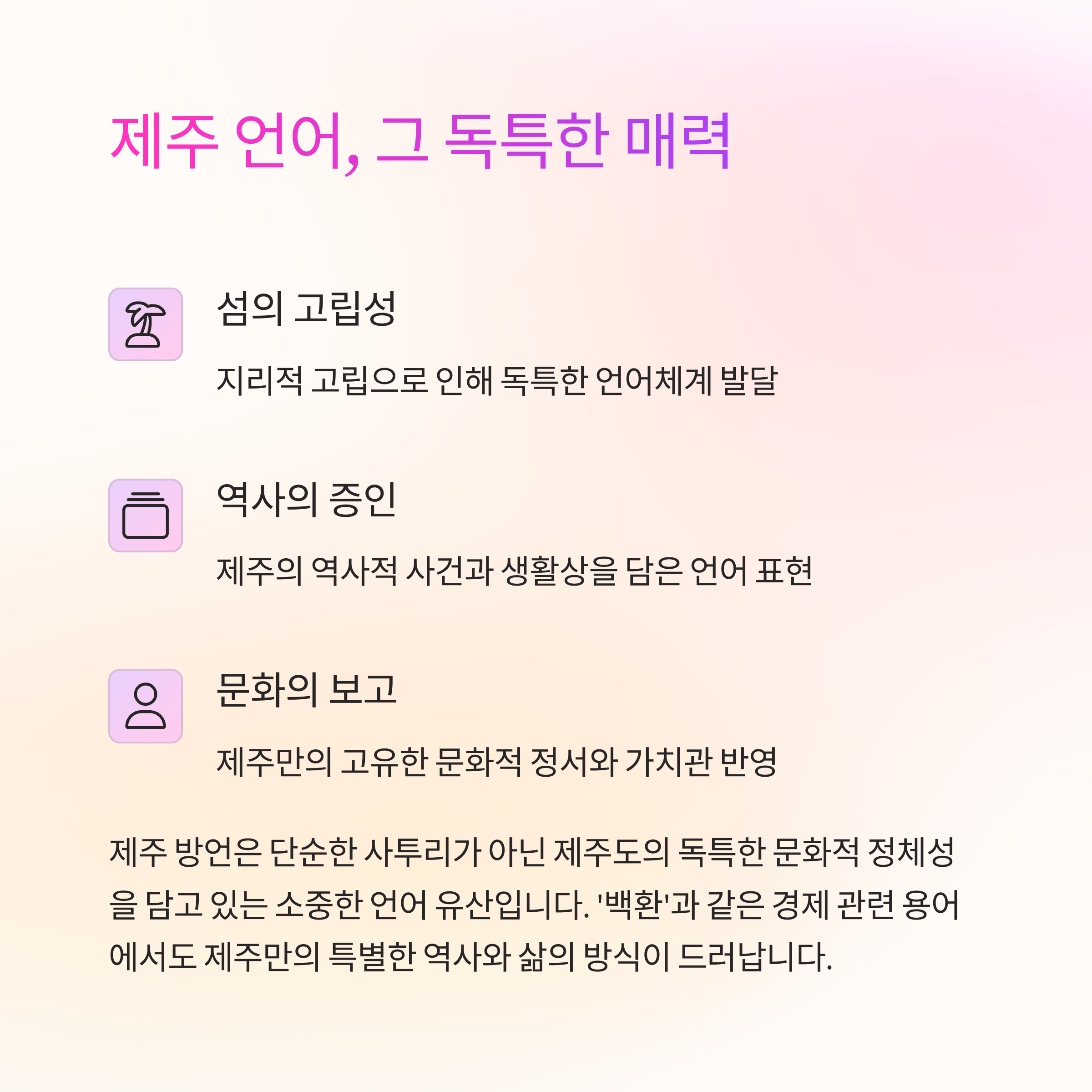 | 문화적 상징성 | 제주 방언 속 역사와 공동체 문화의 상징 |