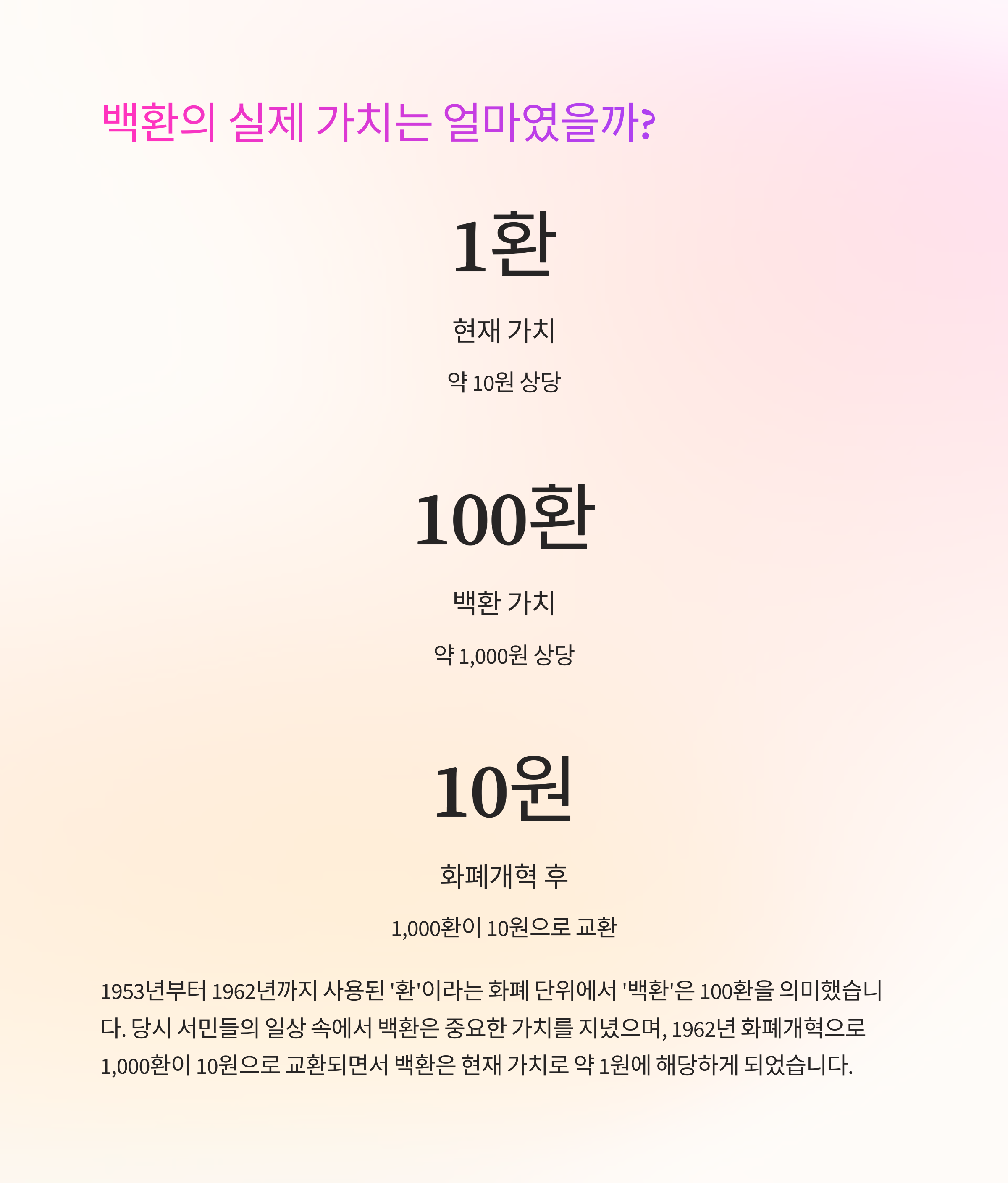 | 백환의 시대적 가치 | 1953년 기준으로 1,000원 상당의 화폐 단위 |