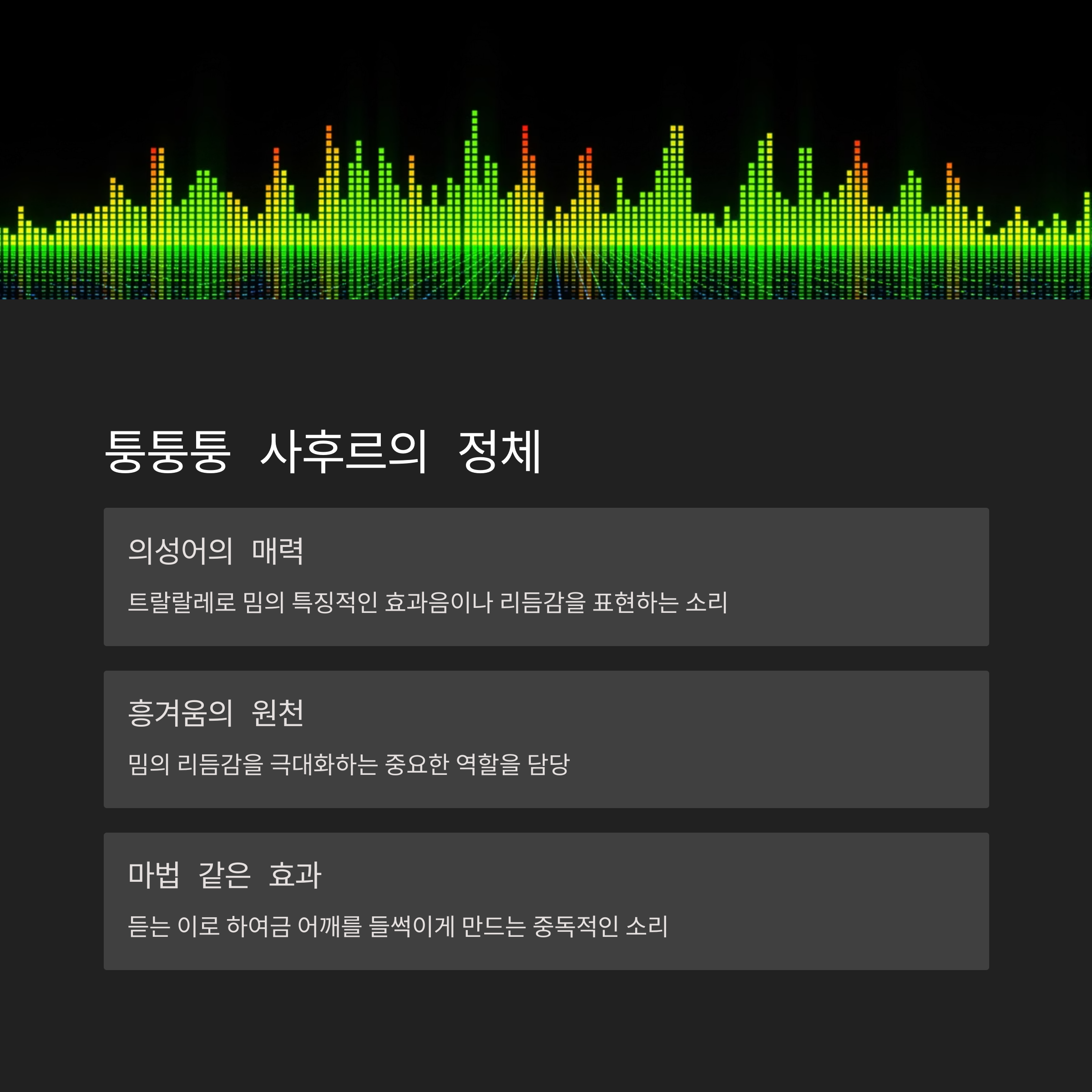 이 소리는 밈의 흥겨움과 리듬감을 극대화하는 중요한 역할을 합니다.