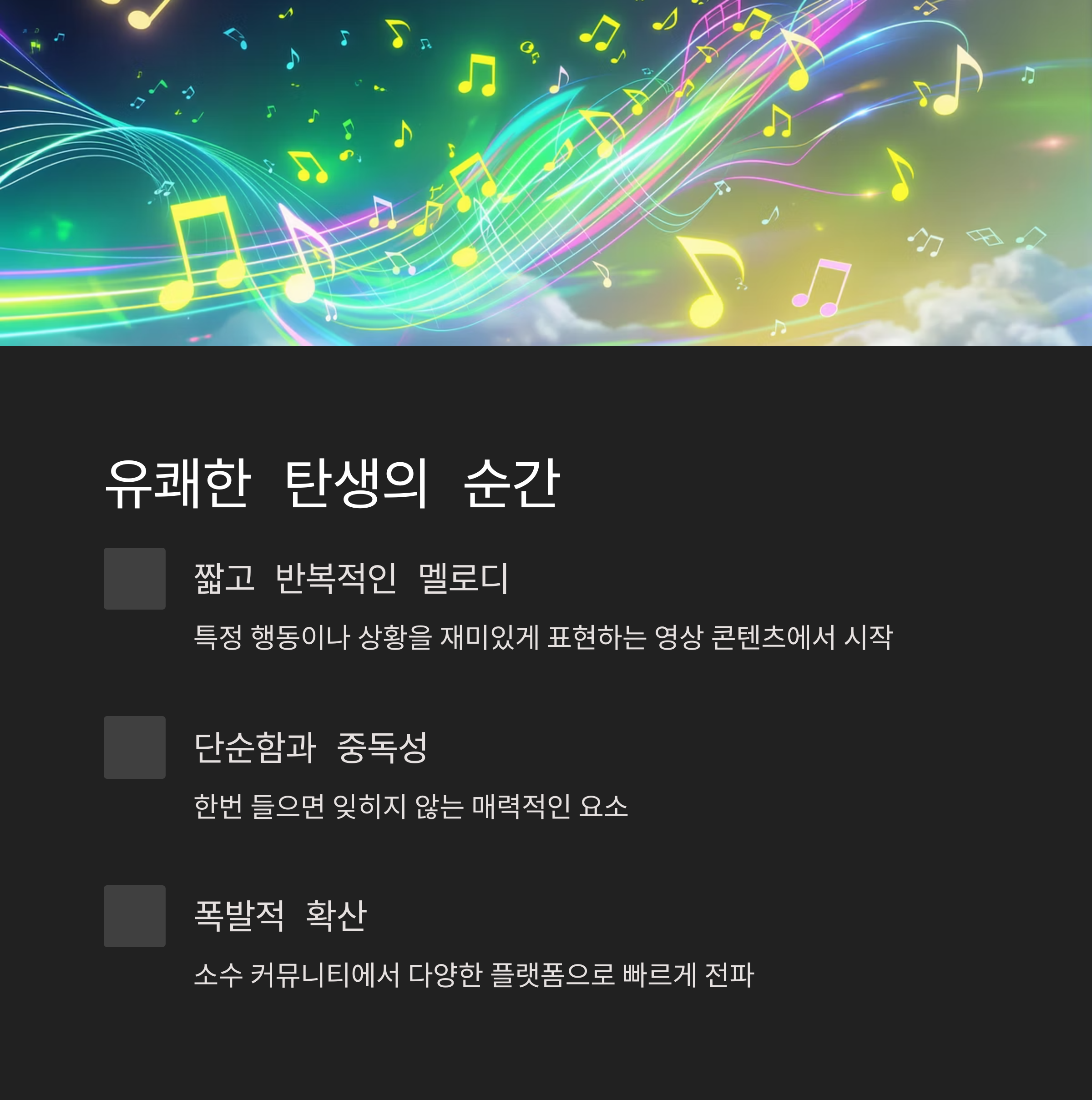 주로 짧고 반복적인 멜로디와 함께 특정 행동이나 상황을 재미있게 표현하는 영상 콘텐츠에서 시작된 것으로 보입니다.
